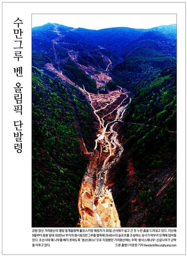 경향은 강원 정선 가리왕산의 평창 동계올림픽 활강 스키장 예정지가 30일 산사태가 쓸고 간 듯 누런 흙을 드러내고 있는 모습을 보도했다. 지난해 9월부터 중봉 일대 183만㎡ 부지의 원시림 5만 그루를 벌목해 2648m의 슬로프를 조성하는 공사가 마무리 단계에 접어들었다.