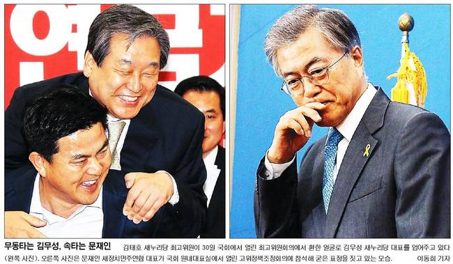 국민, 동아, 서울 김태호 새누리당 최고위원이 30일 국회에서 열린 최고위원회에서 환한 얼굴로 김무성 새누리당 대표를 업어주고 있는 모습과 문재인 새정치민주연합 대표가 국회 원내대표실에서 열린 고위정책조정회의에서 굳은 표정을 짓고 있는 모습을 담았다.