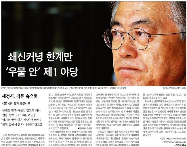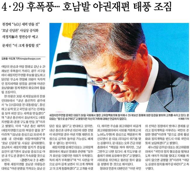 중앙은 새정치민주연합 문재인 대표가 30일 국회에서 4‧29 재‧보궐선거 패배에 대한 입장을 밝히는 모습과 광주 서을에서 무소속으로 당선된 천정배 의원이 세력화 구상을 밝히는 모습을 전했다.