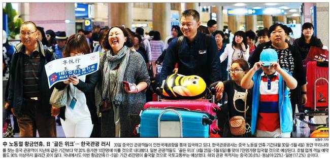 조선은 '中 노동절 황금연휴, 日 '골든 위크'…한국관광 러시'란 1면 사진기사를 통해 30일 중국인 관광객들이 인천국제공항을 통해 입국하는 모습을 담았다.