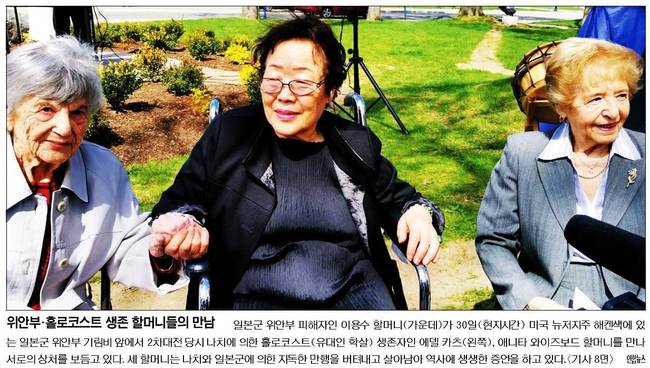 국민은 일본군 위안부 피해자인 이용수 할머니가 4월30일(현지시간) 미국 뉴저지 해켄색에 있는 일본군 위안부 기림비 앞에서 2차 대전 당시 나치에 의한 홀로코스트(유대인 학살) 생존자인 에델 카츠, 애니타 와이즈보드 할머니를 만나는 모습을 담았다.