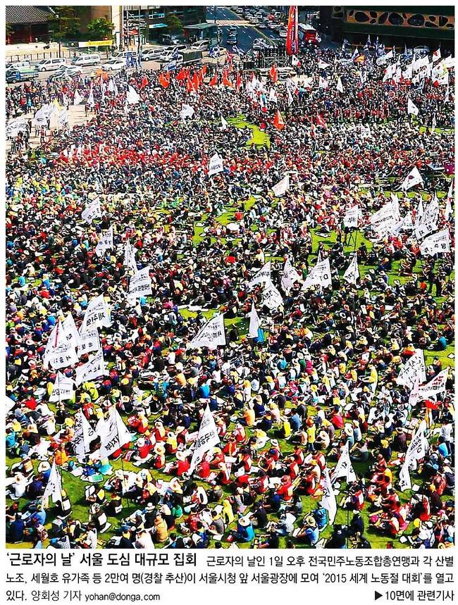 동아는 근로자의 날인 1일 오후 전국민주노동조합연맹과 각 산별노조, 세월호 유가족 등 2만여명(경찰 추산)이 서울시청 앞 서울광장에 모여 '2015 세계 노동절 대회'를 열고 있는 모습을 담았다.