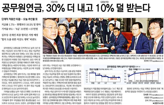 서울은 1일 국회에서 유승민 새누리당 원내대표와 우윤근 새정치민주연합 원내대표가 만나 공무원연금 개혁에 대해 논의하는 모습을 전했다.