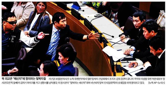 조선, 중앙 등은 30일 미국 뉴욕 유엔 본부에서 열린 북한인권토론에서 탈북자 조지프 김이 북한의 인권 상황에 대해 증언하는 도중, 북한 유엔대표부 직원 3명이 발언권을 얻지 않은 채 "탈북자들은 조국을 버린 배신자들"의 내용이 담긴 성명서를 읽고 있는 장면을 실었다. 그러자 이들의 앞줄에 앉아있던 한 탈북 남성이 앉은 채로 북한 관계자들을 향해 등을 돌려 돌발행동을 중단할 것을 요구하고 있다.