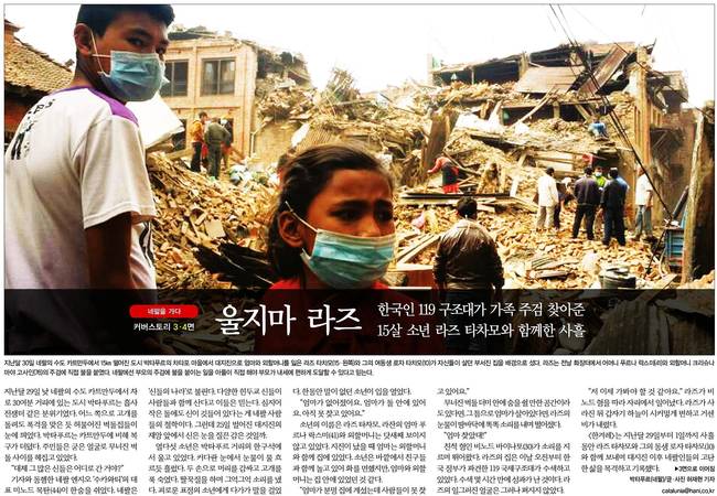 한겨레는 4월30일 네팔의 수도 카트만두에서 15km 떨어진 도시 박타푸르의 치타포 마을에서 대지진으로 엄마와 외할머니를 잃은 라즈 타차모와 그의 여동생 라자 타차마가 자신들이 살던 부서진 집 앞에 있는 모습을 전했다.