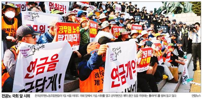 한국은 전국공무원노동조합원들이 1일 서울 여의도 국회 앞에서 기습 시위를 열고 공무원연금 개악 중단 등을 주장하는 플래카드를 펼쳐들고 있는 장면을 담았다.