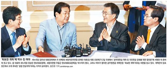 동아일보는 4일 ‘퇴보한 개혁에 박수 친 여야’라는 제목의 1면 사진을 통해 이번 합의를 ‘배보다 배꼽 더 키운 연금담합’이라고 비판했다. 동아일보는 새누리당 김무성 대표와 새정치연합 문재인 대표가 2일 국회에서 ‘공무원연금 개혁 및 국민연금 강화를 위한 합의문’에 서명한 뒤 환하게 웃고 있는 모습을 1면 사진으로 전하며 “문 대표와 새누리당 유승민 대표, 새정치연합 우윤근 원내대표는 박수까지 쳤다”고 보도했다. 이어 “그러나 여야가 합의한 공무원연금 개혁안은 ‘퇴보한 개혁’이라는 비판을 받고 있다”며 “개혁안이 당초 원안에서 크게 후퇴한 ‘담합 연금개혁’이라는 지적이 쏟아졌다”고 지적했다.