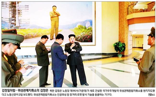 북한 김정은 노동당 제1비서의 위성관제지휘소 방문을 1면 사진으로 전한 신문도 있었다. 경향신문은 ‘김정일처럼…위성관제지휘소의 김정은’이란 제목의 1면 사진을 통해 “김정은이 새로 건설된 국가우주개발국 위성관제종합지휘소를 현지지도 했다고 노동신문이 3일 보도했다. 위성관제종합지휘소는 인공위성 등 장거리 로켓 발사 기술을 총괄하는 기구”라고 보도했다.