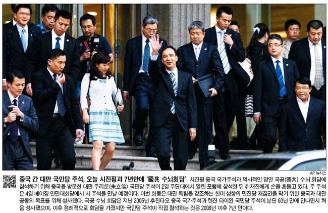 시진핑 중국 국가주석과 대만 주리룬 국민당 주석의 국공 수뇌회담 참석을 주목한 신문도 있었다. 조선일보는 시진핑과 주리룬이 2일 푸단대에서 열린 포럼에 참석한 뒤 취재진에게 손을 흔드는 모습을 1면 사진으로 전하며 “주 주석은 4일 베이징 인민대회당에서 시 주석을 만날 예정”이라고 보도했다. 이어 “이번 회동은 대만 독립을 강조하는 친미 성향의 민진당 재집권을 막기 위한 중국과 대만 공동의 목표를 위해 성사됐다”며 “국공 수뇌회담은 지난 2005년 후진타오 중국 국가주석과 롄잔 타이완 국민당 주석이 분단 60년 만에 만나면서 처음 성사됐으며, 이후 정례적으로 회담을 가졌지만 국민당 주석이 직접 참석하는 것은 2008년 이후 7년 만”이라고 전했다.