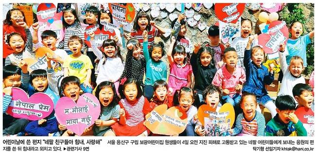 한겨레는 서울 용산구 구립 보광어린이집 원생들이 4일 오전 지진 피해로 고통 받고 있는 네팔 어린이들에게 응원의 편지를 쓴 뒤 힘내라고 외치는 모습을 1면 사진으로 내걸었다. 한겨레는 “원생 60여명은 지진 피해로 고통 받는 네팔 어린이들을 응원하는 편지를 썼다”며 “아이들 저마다의 바람이 적힌 편지는 국제구호단체 굿네이버스를 통해 구호물품과 함께 네팔 아이들에게 전달된다”고 보도했다.