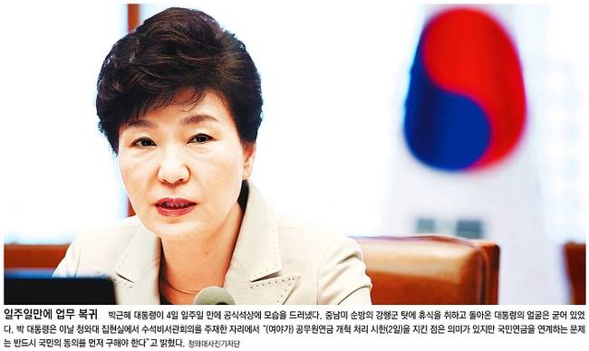 동아일보는 ‘일주일 만에 업무 복귀’라는 제목의 사진을 통해 “박 대통령이 4일 일주일 만에 공식석상에 모습을 드러냈다”고 보도했다. 동아일보는 “중남미 순방의 강행군 탓에 휴식을 취하고 돌아온 대통령의 얼굴은 굳어 있었다”며 “박 대통령은 이날 청와대 집현실에서 수석비서관회의를 주재한 자리에서 ‘여야가 공무원연금 개혁 처리 시한을 지킨 점은 의미가 있지만 국민연금을 연계하는 문제는 반드시 국민의 동의를 먼저 구해야 한다’고 밝혔다”고 전했다.
