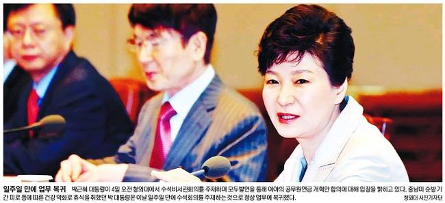 박근혜 대통령이 1주일간의 와병(臥病) 정치를 끝내고 4일 청와대에서 주재한 수석비서관회의에 참여했다. 다수의 주요 일간지들은 박 대통령이 수석비서관회의에서 발언하는 모습을 1면 사진으로 담았다.