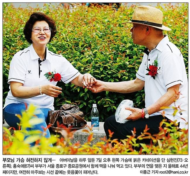 어버이날이다. 붉은 카네이션을 가슴에 꽂아드리며 부모님에게 키워 준 감사함을 전해야 하는 날이다. 한겨레는 어버이날을 하루 앞둔 7일 오후 왼쪽 가슴에 붉은 카네이션을 단 심현진, 홍숙애씨 부부가 서울 종로구 종묘공원에서 함께 떡을 나눠 먹고 있는 모습을 1면 사진으로 담았다. 한겨레는 “부부의 연을 맺은 지 올해로 44년째이지만, 여전히 마주보는 시선 끝에는 웃음꽃이 피어난다”며 사진에 ‘부모님 가슴 허전하지 않게…’라는 제목을 달았다.
