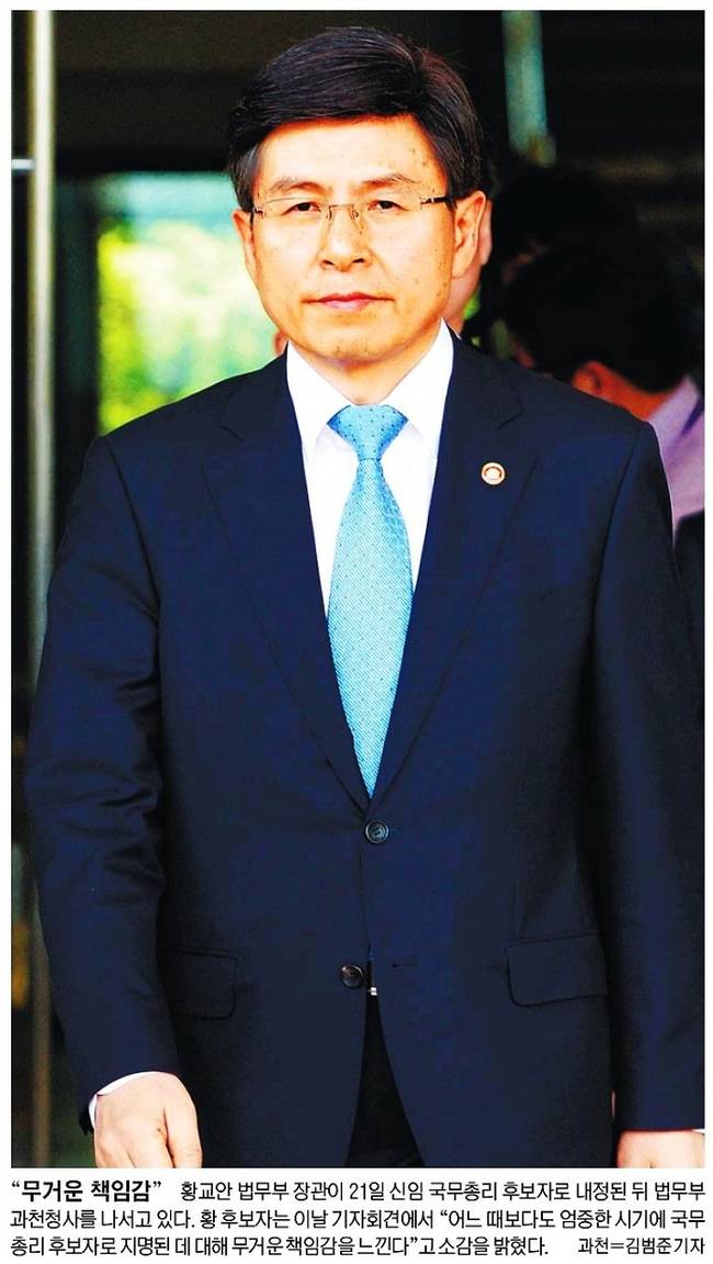 박근혜 대통령은 21일 신임 국무총리 후보자에 황교안 법무부 장관을 지명했다. 이완구 전 총리 사표 수리 이후 24일 만이다. 부총리가 아닌 장관이 총리로 직행한 건 1987년 대통령 직선제 이후 유례가 없다. 22일 대부분의 주요 일간지들은 황교안 법무부 장관의 모습을 1면 사진으로 담았다.
