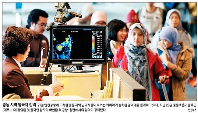 경향신문은 21일 인천공항에 도착한 중동지역 입국자들이 적외선 카메라가 설치된 검역대를 통과하고 있는 모습을 1면 사진으로 담았다. 경향신문은 “지난 20일 메르스에 감염된 첫 한국인 환자가 확인된 후 공항·항만에서의 검역이 강화됐다”고 전했다.