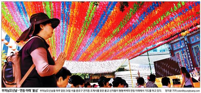 경향신문, 세계일보는 ‘부처님 오신 날’을 하루 앞둔 24일 서울 종로구 조계사를 찾은 불교 신자들이 형형색색의 연등 아래에서 기도하는 모습을 실었다.