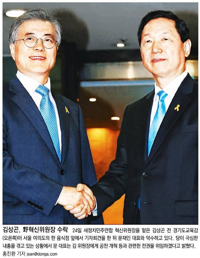 동아일보는 24일 새정치민주연합 혁신위원장을 맡은 김상곤 전 경기도교육감이 서울 여의도의 한 음식점 앞에서 기자회견을 한 뒤 문재인 대표와 악수하는 모습을 실었다.