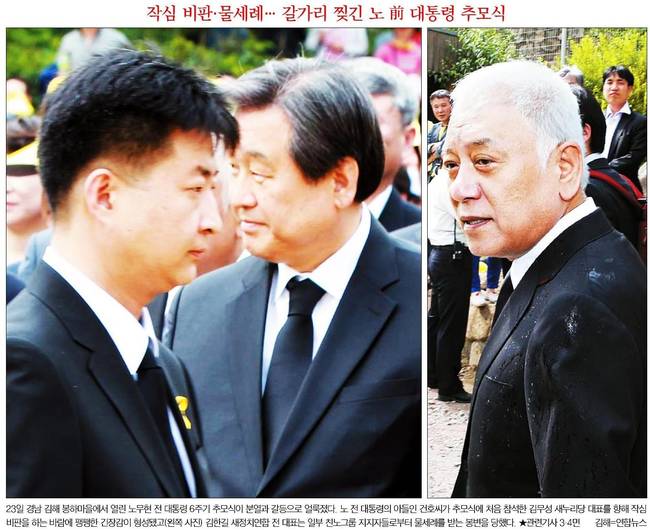 한국일보도 지난 23일 경남 김해 봉하마을에서 열린 노무현 전 대통령 6주기 추모식이 분열과 갈등으로 얼룩졌다며 노 전 대통령의 아들인 건호씨가 추모식에 처음 참석한 김무성 새누리당 대표를 향해 작심 비판하는 바람에 팽팽한 긴장감이 형성된 모습과 김한길 새정치연합 전 대표가 일부 친노 그룹 지지자들로부터 물세례를 받는 등 봉변을 당한 모습을 담았다.