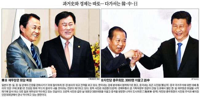 조선은 일본이 한‧일, 중‧일 관계의 긴장을 완화시키기 위해 철저하게 정‧경 분리의 외교 전략을 펴고 있다는 소식을 전하며 지난 23일 도쿄에서 열린 한‧일 재무장관 사진과 같은 날 중국을 방문한 니카이 도시히로 자민당 총무회장이 시진핑 주석과 베이징 인민대회당에서 만나 악수하고 있는 사진을 함께 실었다.