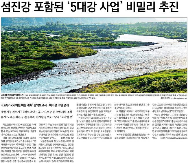 경향신문은 26일 '습지를 왜 망가뜨리려는가'라는 1면 사진 기사를 통해 지난 25일 공개된 국토교통부의 '국가하천 하천구역지구지정 기준 및 이용보전계획' 최종 보고서에는 섬진강 지역 천변의 10%가 넘는 2318m²를 친수지구로 새로 지정하는 내용이 포함됐다고 전했다.