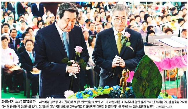 동아일보는 새누리당 김무성 대표와 새정치민주연합 문재인 대표가 25일 서울 조계사에서 열린 불기 2559년 부처님오신날 봉축법요식에 참석해 관불단에 헌화하고 있는 장면을 실었다.