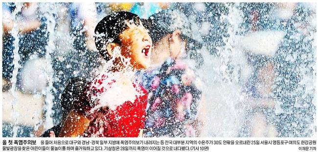 서울신문, 세계일보는 올 들어 처음으로 대구와 경남‧경북 일부 지방에 폭염주의보가 내려지는 등 전국 대부분 지역의 수은주가 30도 안팎으로 오르내린 25일 어린이들이 물놀이를 하며 즐거워하고 있는 모습을 담았다.