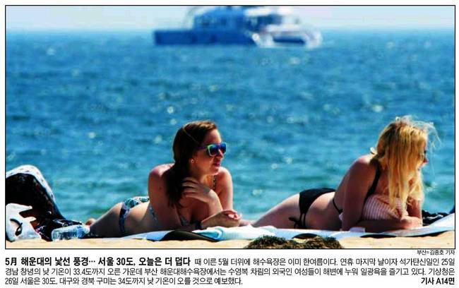 조선일보도 때 이른 5월 더위에 해수욕장은 이미 한여름인 가운데 연휴 마지막 날이자 석가탄신일인 25일 부산 해운대해수욕장에서 수영복 차림의 외국인 여성들이 해변에 누워 일광욕을 즐기는 장면을 전했다.