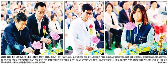 한겨레는 불기 2559년 부처님 오신 날을 맞아 25일 오전 서울 종로구 견지동 조계사에서 열린 대한불교조계종 '봉축 법요식'에서 '이웃과 함께하는 법요식'을 연다는 뜻으로 초대된 카만 싱 라마 주한네팔대사와 전명선 세월호가족대책위원장, 성소수자인 김조광수 영화감독, 유흥희 금속노조 기륭전자분회장이 차례로 관불단에 꽃을 바치는 장면을 실었다.