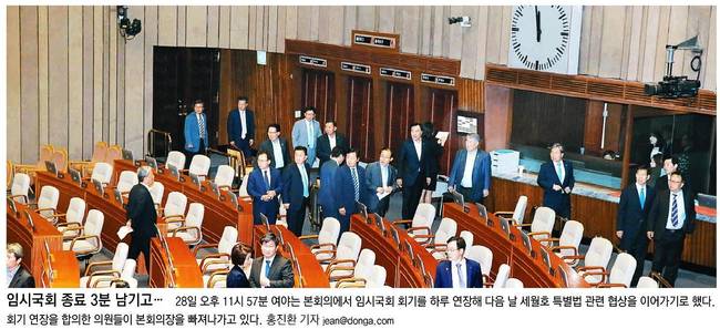 동아일보는 지난 28일 밤 11시57분 여야가 본회의에서 임시국회 회기를 하루 연장해 다음 날 세월호 특별법 관련 협상을 이어가기로 했다는 소식을 전했다.