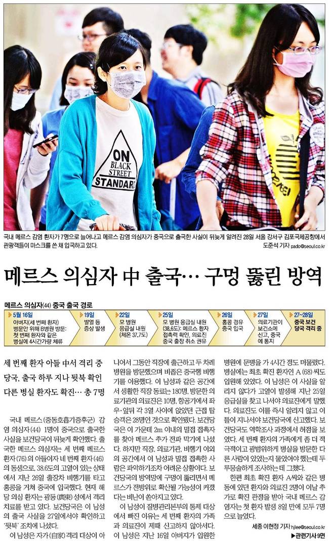서울신문은 국내 메르스 감염 환자가 7명으로 늘어나고 메르스 감염 의심자가 중국으로 출국한 사실이 뒤늦게 알려진 26일 서울 강서구 김포국제공항에서 관광객들이 마스크를 쓴 채 입국하고 있는 장면을 실었다.