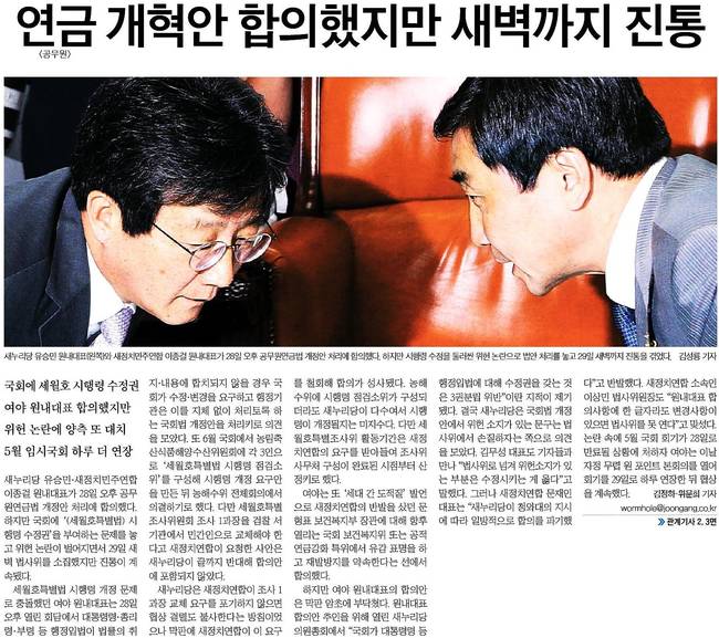 세계일보, 중앙일보, 한겨레는 새누리당 유승민 원내대표와 새정치민주연합 이종걸 원내대표가 28일 오후 공무원연금법 개정안을 논의하는 모습을 실었다.