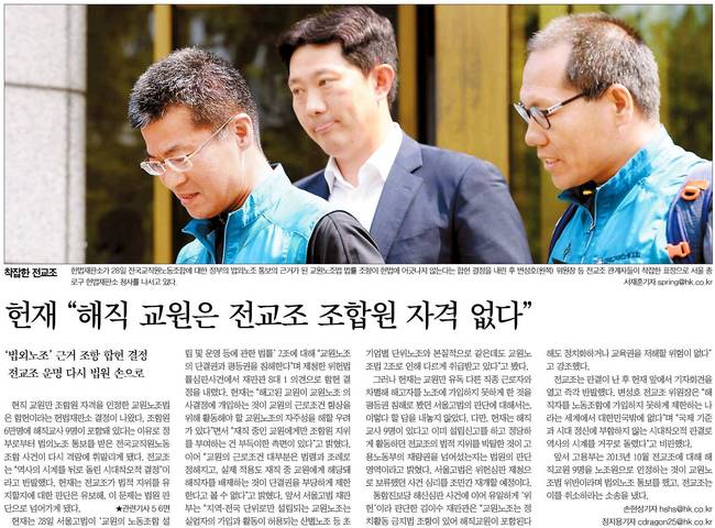 한국일보는 헌법재판소가 28일 전국교직원노동조합에 대한 정부의 법외노조 통보의 근거가 된 교원노조법 법률 조항에 헌법에 어긋나지 않는다는 합헌 결정을 내린 후 변성호 위원장 등 전교조 관계자들이 착잡한 표정으로 서울 종로구 헌법재판소 청사를 나서고 있는 장면을 담았다.