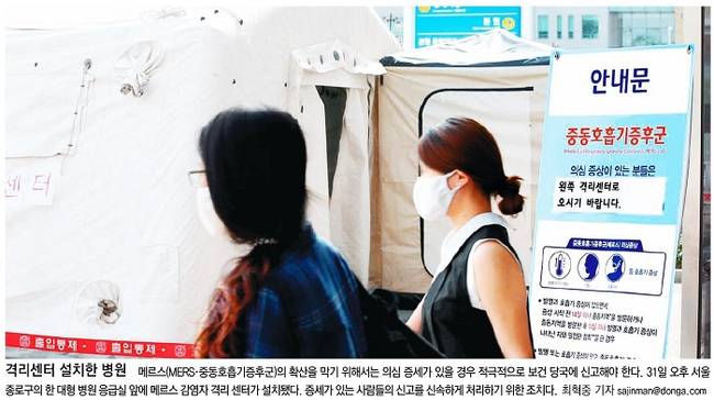 동아일보, 서울신문, 한국일보는 메르스 확산 방지 대책을 세우는 병원의 모습을 1면 사진으로 내걸었다. 동아일보는 31일 서울 종로구의 한 대형 병원 응급실 앞에 메르스 감염자 격리 센터가 설치된 모습을 1면 사진으로 전하며 “메르스의 확산을 막기 위해서는 의심 증세가 있을 경우 적극적으로 보건 당국에 신고해야 한다”고 전했다.
