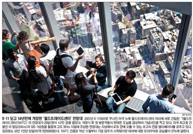 조선일보는 개장식 후 첫 방문객들이 맨해튼 도심을 감상하며 기념사진을 찍고 있는 모습을 1면 사진으로 내걸었다. 조선일보는 “미국 최고층 건물인 이 빌딩(541m)의 100~102층을 활용해 고도 381m 지점에 조성한 전망대는 지상에서 47초 만에 오를 수 있는 초고속 전용 엘리베이터를 갖추고 있다”며 “1WTC 건물은 작년 11월부터 기업 입주가 시작됐지만 테러에 대한 트라우마로 공실률이 37%에 달한다”고 보도했다.