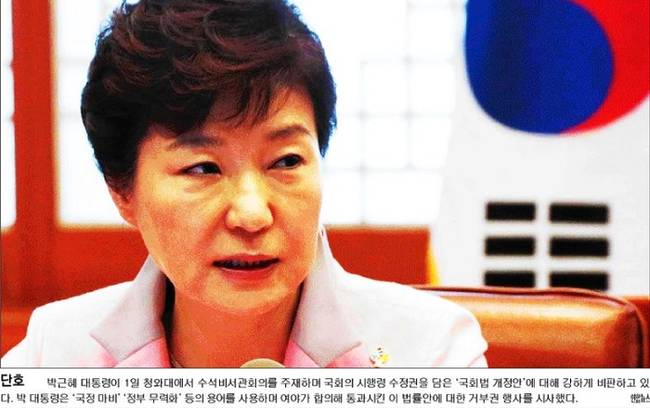 국민일보는 ‘단호’라는 제목의 사진을 통해 박 대통령이 수석비서관회의에서 국회의 시행령 수정권을 담은 국회법 개정안에 대해 강하게 비판하고 있는 모습을 1면에 담았다. 국민일보는 “박 대통령은 ‘국정 마비’ ‘정부 무력화’ 의 용어를 사용하며 여야가 합의해 통과시킨 이 법률안에 대한 거부권 행사를 시사했다”면서 “국회법 개정안이 정부의 행정입법권을 침해하는 위헌 소지가 다분한 만큼 그대로 수용할 수 없다는 의지를 분명히 한 것”이라고 전했다.