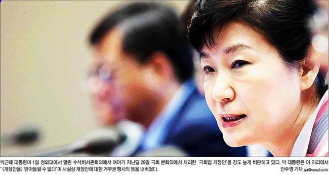 서울신문도 박 대통령이 수석비서관회의에서 국회법 개정안을 강도 높게 비판하고 있는 모습을 1면 사진으로 내걸었다. 서울신문은 “박 대통령은 이 자리에서 ‘개정안을 받아들일 수 없다’며 사실상 개정안에 대한 거부권 행사의 뜻을 내비쳤다”면서 “이에 새누리당은 친박근혜계를 중심으로 국회법 개정안의 ‘위헌 논란’에 대한 대응책 마련에 돌입했고 새정치민주연합은 ‘입법부와의 전쟁 선포로 받아들일 수밖에 없다’며 이후 여권과의 충돌을 예고했다”고 보도했다.