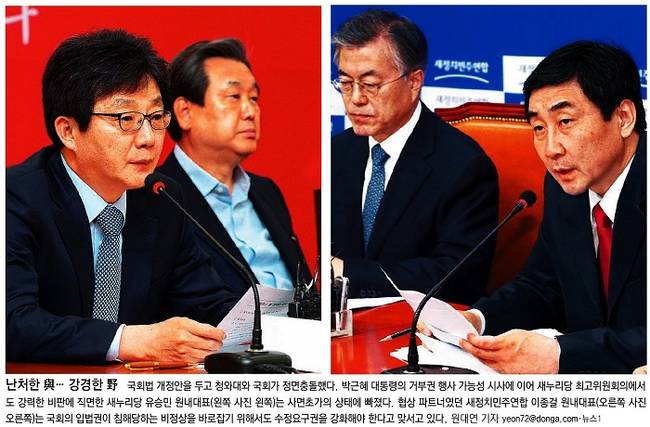 동아일보는 난처한 여당의 모습과 강경한 야당의 모습을 1면 사진으로 전했다. 동아일보는 “박 대통령의 거부권 행사 가능성 시사에 이어 새누리당 최고위원회의에서도 강력한 비판에 직면한 유승민 원내대표는 사면초가의 상태에 빠졌다”면서 “협상 파트너였던 새정치연합 이종걸 원내대표는 국회의 입법권이 침해당하는 비정상을 바로잡기 위해서도 수정요구권을 강화해야 한다고 맞서고 있다”고 보도했다.