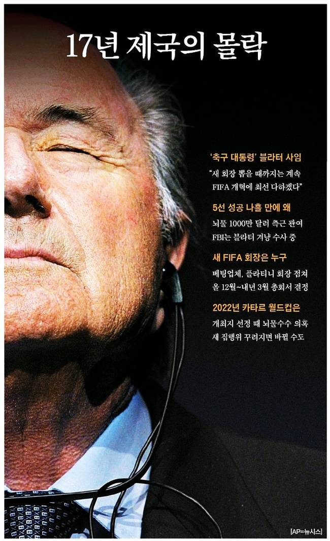 중앙일보는 ‘17년 제국의 몰락’이라는 제목의 1면 사진을 통해 “그가 17년간 쌓아올린 ‘황금의 제국’은 막을 내렸다. 그의 재임 중 FIFA는 천문학적 규모의 수익 기관으로 성장했다”고 전했다. 중앙일보는 “그러나 제국은 부패와 추문으로 얼룩졌다”며 “미 수사당국의 수사가 블라터의 목을 졸랐다”고 보도했다.