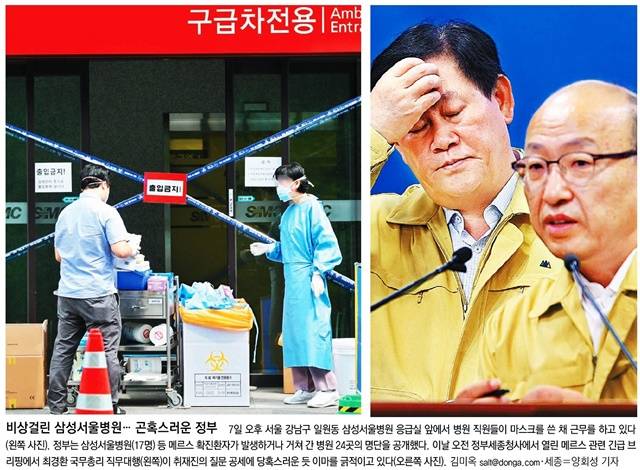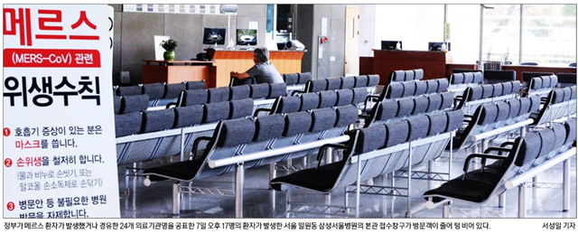 경향신문과 세계일보는 17명의 환자가 발생한 서울 일원동 삼성서울병원의 텅 빈 로비를 1면 사진으로 택했다. 동아일보는 ‘비상걸린 삼성서울병원… 곤혹스러운 정부’라는 1면 사진기사에서 “7일 오후 서울 강남구 일원동 삼성서울병원 응급실 앞에서 병원 직원들이 마스크를 쓴 채 근무를 하고 있다”며 “이날 오전 정부세종청사에서 열린 메르스 관련 긴급 브리핑에서 최경환 국무총리 직무대행이 취재진의 질문 공세에 당혹스러운 듯 이마를 긁적이고 있다”고 보도했다.