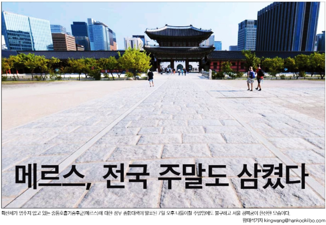 한국일보는 한산한 경복궁의 모습을 1면에 담고 관련 기사에서 “갈수록 감염 확진자와 사망자가 늘면서 화창한 날씨에도 시민들이 많이 모이는 주요 여가시설에는 인파가 자취를 감췄고, 경제·산업·문화 각 분야에도 여파가 미치는 등 메르스 공포가 사회를 뒤덮는 분위기”라고 전했다.