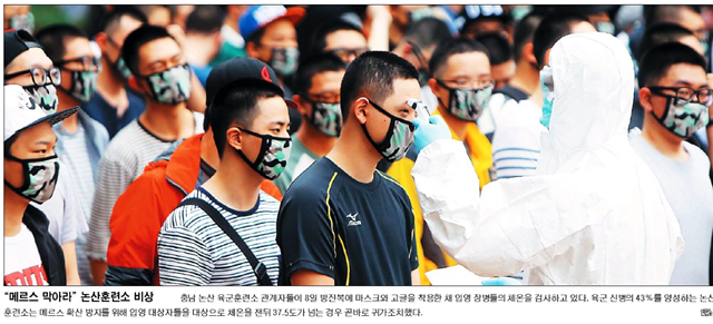 메르스가 계속 확산되면서 국민 생활 전반에 영향을 미치고 있다. 국민일보는 충남 논산 육군훈련소에서 방진복에 마스크와 고글을 착용한 관계자들이 입영 장병의 체온을 검사하는 사진을 1면에 실었다.