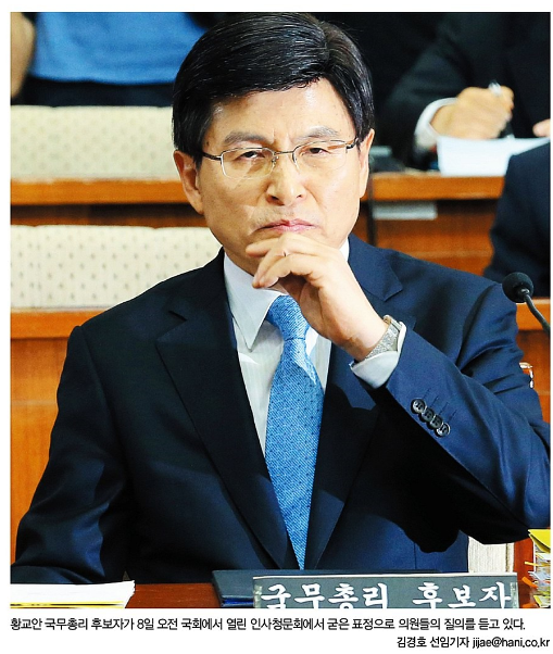 지난 8일 황교안 국무총리 후보자의 인사청문회에서 황 후보자의 종합소득세 늑장납부, 병역면제, 전관예우 등이 도마에 올랐다. 한겨레는 굳은 표정으로 의원들의 질의를 받고 있는 황 후보자의 사진을 1면에 실었다.