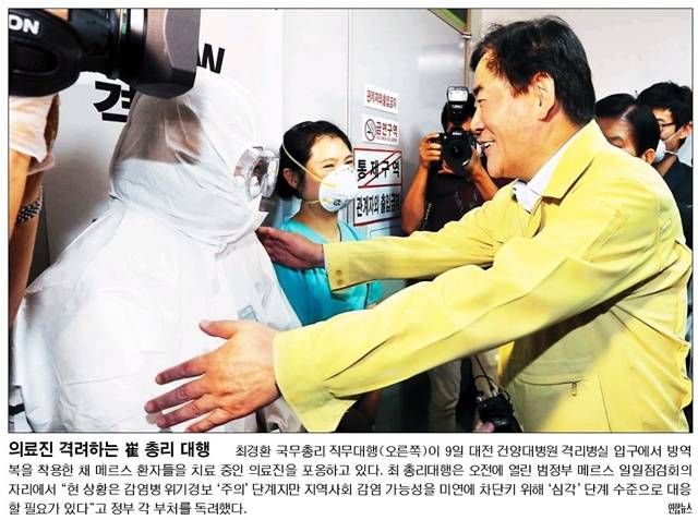 최경환 국무총리 직무대행이 지난 9일 대전 건양대병원에서 메르스 환자를 진료 중인 의료진을 격려 방문했다. 국민일보, 서울신문, 세계일보, 조선일보는 관련 사진을 1면에 실었다.