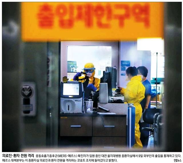 경향신문은 외부인의 출입을 통제하고 있는 대전 을지대병원 중환자실 모습을 싣고 “메르스 대책본부는 이 중환자실 의료진과 환자 전원을 격리하는 코호트 조치에 들어갔다고 밝혔다”고 전했다.