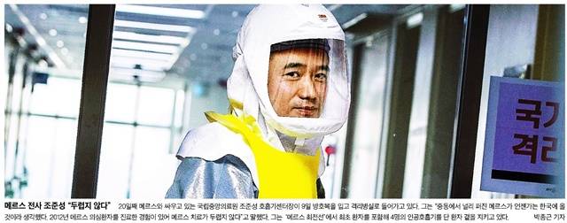 중앙일보는 ‘메르스 최전선’에서 환자 곁을 지키고 있는 국립중앙의료원 조준성 호흡기센터장이 방호복을 입고 격리병실로 들어서는 모습을 1면 사진으로 택했다. 동아일보는 9일 정부세종청사를 방문한 WHO 합동조사단을 1면에 실었다.