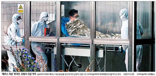 경향신문, 한국일보는 15일자 1면 사진을 통해 슬로바키아에서 메르스 의심 증상을 보인 한국인 남성이 13일 수도 브라티슬라바의 대학병원으로 옮기는 장면을 실었다.
