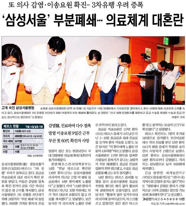 국민일보, 중앙일보는 송재훈 삼성서울병원장 등 의료진이 14일 암병동에서 기자회견을 열어 메르스 확산 사태에 대해 사과하며 고개를 숙이고 있는 장면을 담았다. 삼성서울병원은 3차 유행을 차단하기 위해 오는 24일까지 부분 폐쇄에 들어갔다.