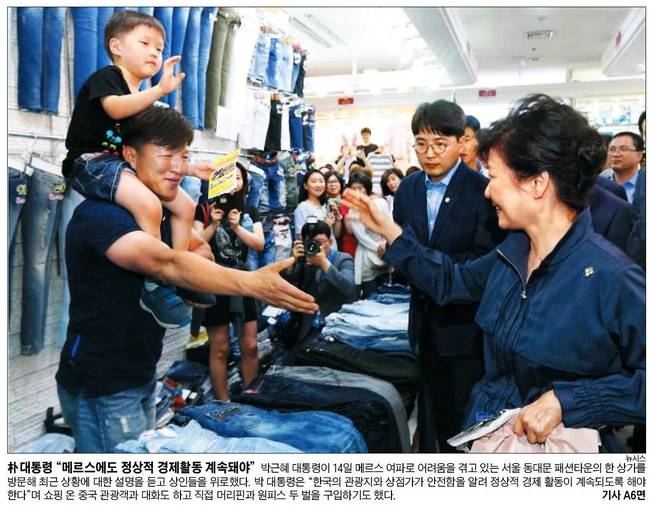 세계일보, 조선일보는 박 대통령이 14일 오후 메르스 사태에 따른 손님 격감으로 피해를 보고 있는 서울 동대문 패션상점가를 찾아 한 상인과 얘기를 나누며 격려하는 모습을 실었다.