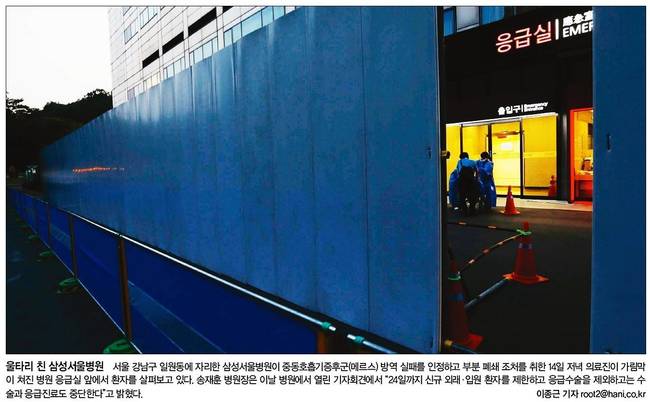 한겨레는 서울 강남구 일원동에 자리한 삼성서울병원이 중동호흡기증후군 방역 실패를 인정하고 부분 폐쇄 조처를 취한 14일 저녁 의료진이 가림막이 처진 병원 응급실 앞에서 환자를 살펴보는 모습을 담았다.
