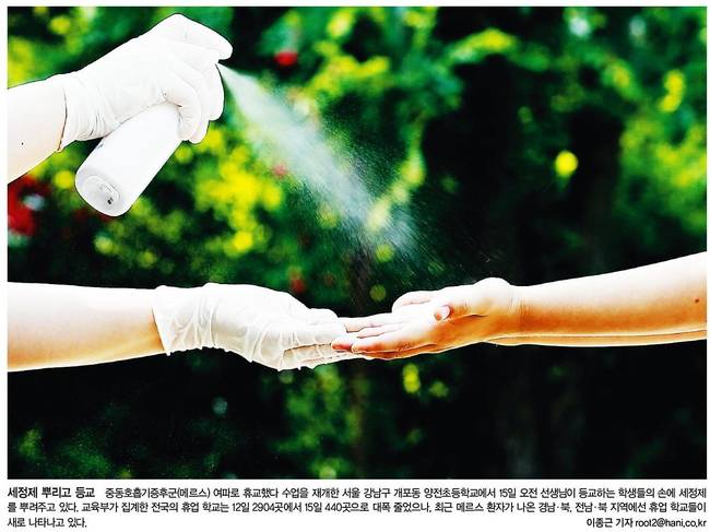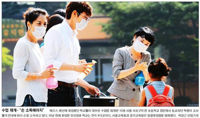국민일보도 메르스 확산에 휴업했던 학교들이 대부분 수업을 재개한 15일 서울 서초구의 한 초등학교 정문에서 등교하던 학생이 교사들의 안내에 따라 손을 소득하고 있는 장면을 실었다.
